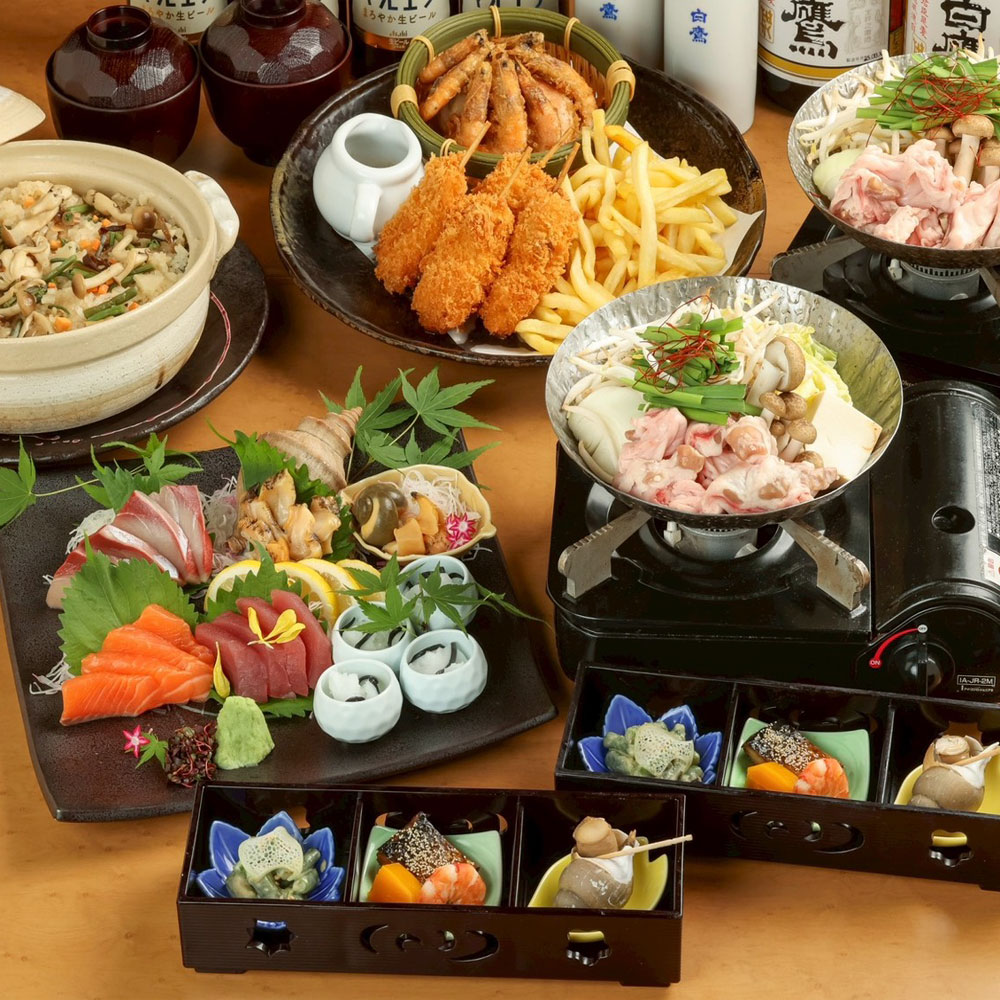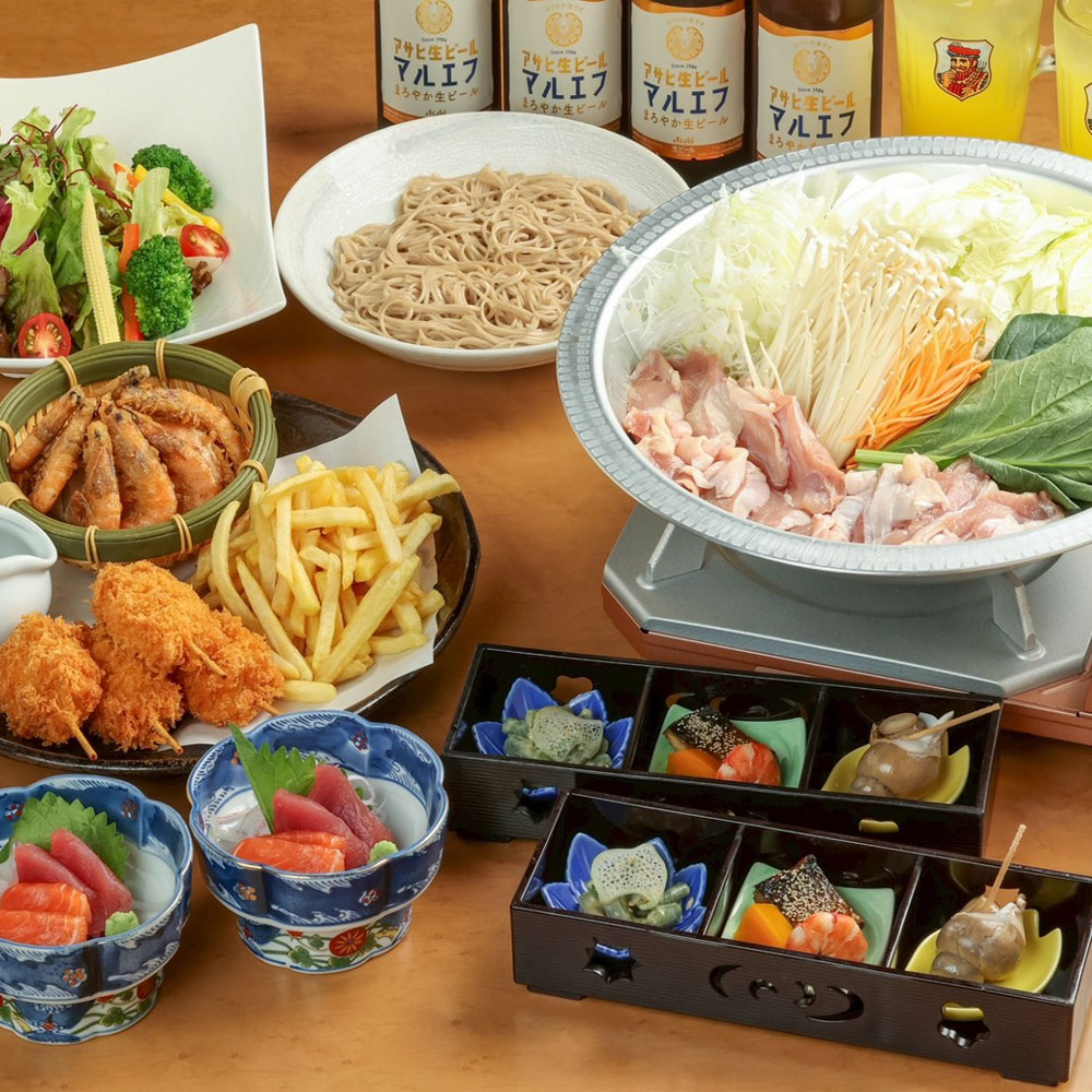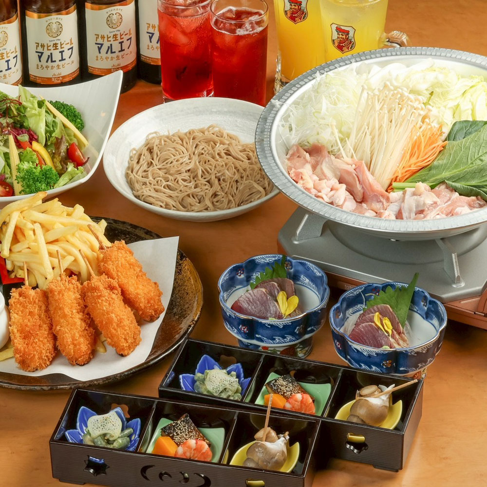 季節の恵みをふんだんに使った全6品。2時間飲み放題付きで旬の前菜やお刺身、彩り野菜のサラダ、香ばしい揚げ物、やさしい味わいの鶏鍋、〆のそばまで、季節を感じる満足コースです!